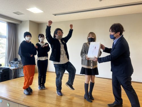 タンスサークルへ同窓会からの差し入れを安田会長から手渡しで。