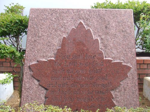 学校玄関向かえにある、学院聖句を刻んだ石碑です。