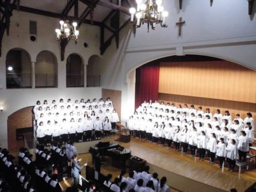 静岡英和女学院礼拝堂にハンドベルクワイアの演奏が流れ、